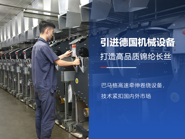 <p><span style="text-indent: 28px; white-space: normal;">先后引進(jìn)德國(guó)巴馬格高速牽伸卷繞設(shè)備FDY生產(chǎn)線(xiàn)12條96位,POY生產(chǎn)線(xiàn)4條48位,共計(jì)144位,加彈機(jī)共22臺(tái),6臺(tái)經(jīng)緯機(jī),每臺(tái)機(jī)264個(gè)錠位;2臺(tái)蘇州巴馬格機(jī),每臺(tái)機(jī)264個(gè)錠位;7臺(tái)RPR加彈機(jī),每臺(tái)機(jī)240個(gè)錠位,5臺(tái)ICBT加彈機(jī),每臺(tái)機(jī)240個(gè)錠位,2臺(tái)海源加彈機(jī),每臺(tái)288個(gè)錠位,共計(jì)5568個(gè)錠位,具備年產(chǎn)3萬(wàn)噸差別化功能性錦綸長(zhǎng)絲的生產(chǎn)能力的紡織企業(yè)。</span></p>